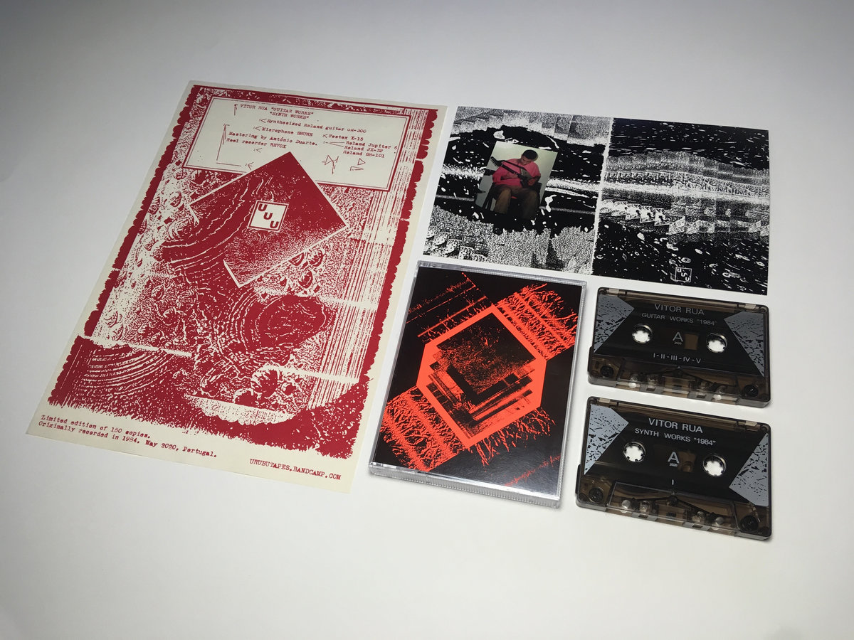 This new edition on URUBU, which has been building quite a remarkable catalogue, as the result of a close documentation of some of the most interesting projects within the Portuguese underground, recovers recordings from 1984 and is divided in two tapes whose titles describe its content in a straightforward manner: “SYNTH WORKS” and “GUITAR WORKS”. However, behind its intentional literalness, there is the wish to avoid the interpretative constraints inevitably linked to any title, as well as a certain dose of irony: the relation with instruments is reconverted, bound to a creative combat between man and machine, reducing the relevance of the origin of sounds, under that same literal point of view, and giving more importance to the way they unfold and expand, allowing to create new languages from available resources.